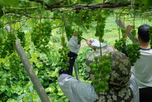 | 返礼品としての農業体験の模様です。生食用ぶどうの粒抜きをしています。 |