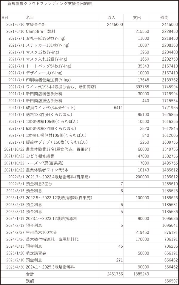 勝沼ワイナリーズクラブでは、新規就農者を支援するため、クラウドファンディングを実施しました。お陰様で、たくさんの方々からご支援をいただき、ご支援額は2,445,000円に達しました。
